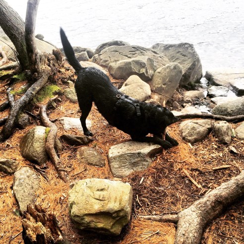 There is a rough trail through the woods, but we went off-roading for some fetching and swimming.
