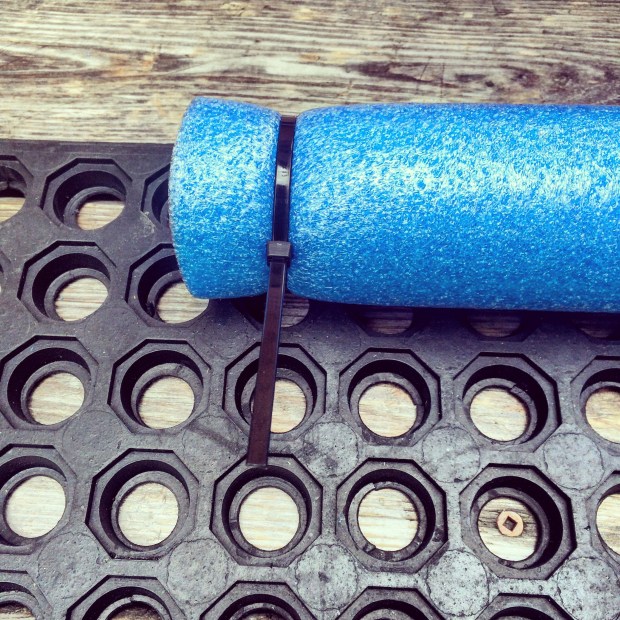 3. Using more zip ties, attach the 2 uncut skinny pool noodles to the long edges of the ramp. We used 6 zip ties for each pool noodle. Leave a space of about 6 inches from the bottom end (the water end) of the ramp. This allows the end of the ramp to sink down into the water a bit, making it easier for your dog to climb up. Make sure to also leave a space of about 1 foot from the top end of the ramp (you’ll understand why later on). If necessary, trim the pool noodles to fit.