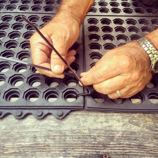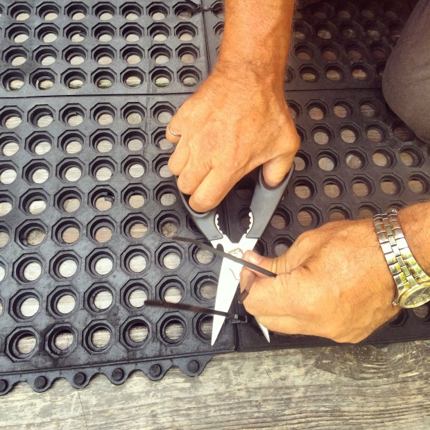 I wove a 15′ mooring line down each side and across the mats (midway), to distribute the stress throughout the ramp… and added surface mounted “cups” with cleats for anchors… employing 76 zip ties in all.