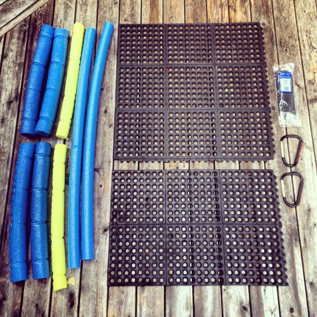 With materials purchased at Menard’s (two 3X3 mats, noodles, mooring line, carabiners), stainless steel mounting hardware, and using my own substantial supply of zip ties… the total came to @ $90.00… WELL under the $400+ the closest commercial alternative would cost!